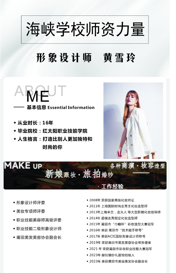 莆田市城厢区闽医堂海峡职业培训学校创办于2002年是一所集现代化专业培训学校,隶属于莆田市劳动和社会保障局审批培训学校。本校特邀请国内多位知名教师主教,科目齐全,师资雄厚,半军事化管理的职业培训学校。学校是以培养影楼化妆/美容/美发/美甲知名学校,更是打造明日之星化妆师/美容师/美发师/美甲师的摇篮,多年来从这里走出的精英人才遍布在全国各地以及欧美、韩、日等国家,在业界享受良好口碑。本校以培养新型实用技术人才为教学理念,学员在学习与实践当中有效结合,更快更好的掌握技术操作本质。为在以后走向工作岗位打下坚实的基础。